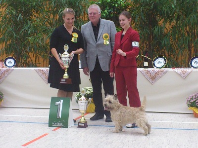 Die zweite Zuchtschau fand in Mittenwalde, südöstlich von Berlin, am 28.07.2007 statt. Ausgerichtet wurde sie von der OG Berliner Himmelhunde. Nachts um 1 Uhr kamen wir nach 5 Stunden Fahrt mit dem Wohnwagen dort an. Als erstes wurden die Cairn Terrier gerichtet, danach waren die Airedales dran. Prompt fing es dann auch zu regnen an und hörte auch den ganzen Tag nicht mehr auf. Gerichtet wurden die Hunde von Frau L. Zake. Es waren 6 Hündinnen im Ring. Wir landeten auf einem guten zweiten Platz mit einem vorzüglich und dem Res.Jgd.CAC. Nachdem alle Hunde gerichtet waren, gab es erst einmal eine kurze Mittagspause. Danach ging es gleich mit dem Juniorhandling weiter. Leider war nur Sarah dort gemeldet. Sie hat es aber trotzdem sehr ernst genommen und dafür auch einen Pokal, eine Riesendose Maoam und einen herzhaften Applaus der Zuschauer bekommen.