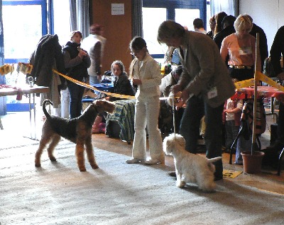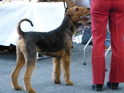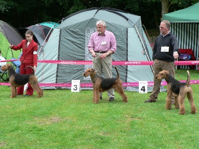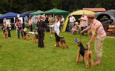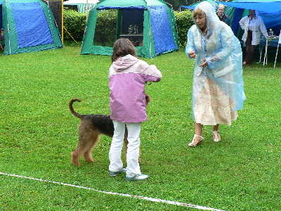 Am nächsten Morgen, dem 29.07.2007 fand die zweite Schau statt. Am selben Ort, aber von der OG 6 Berlin Nord ausgerichtet. An diesem Tag wurden die Airedales von Frau Anne Klaas gerichtet. Diesmal war erst etwas Sonne zu sehen, aber kurz bevor die Airedale Terrier in den Ring sollten, fing es wieder an zu regnen. Trotzdem zeigte Branca sich von ihrer besten Seite. Das hat sich "bezahlt" gemacht: ein knapper Sieg und das zweite Jgd.CAC vor einer Hündin aus dem Zwinger "schwarze Kuhle". Na, da war die Freude riesengroß. Zum BOB hat es dann aber leider nicht gereicht. Dafür hat Sarah beim darauffolgenden Juniorhandling wieder einen Pokal bekommen und für den Hund eine Tüte Hundekekse. Danach durften wir noch einmal in den großen Ring. Dort ging es um den besten Junghund aller Rassen der Schau. Dort belegten wir den dritten Platz hinter einem Westie und auf dem ersten Platz stand ein Scottish Terrier.