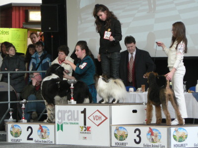 Erster Platz Altersklasse 1 (9-12 Jahre): Sarah und Branca, dann kamen ein Westie, ein Australian Terrier und ein Yorkie. In der zweiten Klasse gewann ein Westie. In dieser Klasse waren noch eine Airedale-Hündin (v. Salome) und noch zwei weitere Hunde.