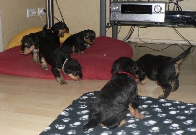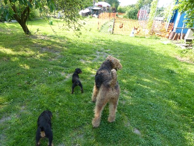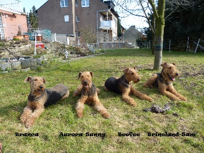 Am 07.05.2008 wurden dann unsere ersten Welpen geboren. Eine Hündin haben wir uns ausgesucht und behalten. Seitdem lebt Aurora-Sunny bei uns. Sie ist eine sehr temperamentvolle Hündin (was sie auf der Zuchtschau in Obernkirchen aber niemanden zeigen wollte), die auch schon mal einen dicken Rüffel von Mama Branca und Frauchen einstecken muss.                                                                                                                                           Trotzdem ist Sunny nun KFT-Jugend-Champion, VDH-Jugend-Champion, VDH-Ausstellungs-Champion und KFT-Ausstellungs-Champion. Branca hat im Sommer 2009 die Bestätigung für den VDH-Ausstellungs-Champion bekommen (2008 waren ja erst einmal die Babys dran). Im November 2011 hat dann unsere Sunny 6 Welpen bekommen. Das kleine Teufelchen Beefee haben wir dann behalten. Sie ist auch KFT-Jugend-Champion, KFT-Ausstellungs-Champion und VDH-Champion.  Auf jeden Fall hat die ganze Familie viel Spass mit den Airedale-Damen.